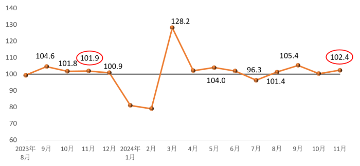 In November 2024, the Prosperity Index of Construction Materials Industry was 102.4 points, up 2.1 points from October, 0.5 points higher than the same month of the previous year, higher than the critical point, in the boom zone, and the industry's economic operation stabilized and replied.