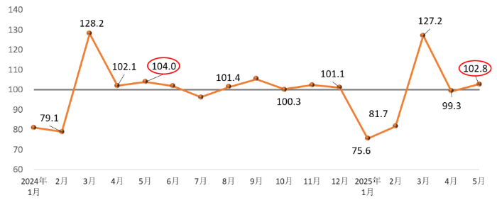 The Building Materials Industry Prosperity Index for May 2025 was 102.8 points, above the critical threshold. It increased by 3.5 points compared to April and is within the expansionary range, but 1.2 points lower than the same month last year. The May index indicates that the building materials industry experienced fluctuating recovery, though its performance remains weaker compared to the same period last year.